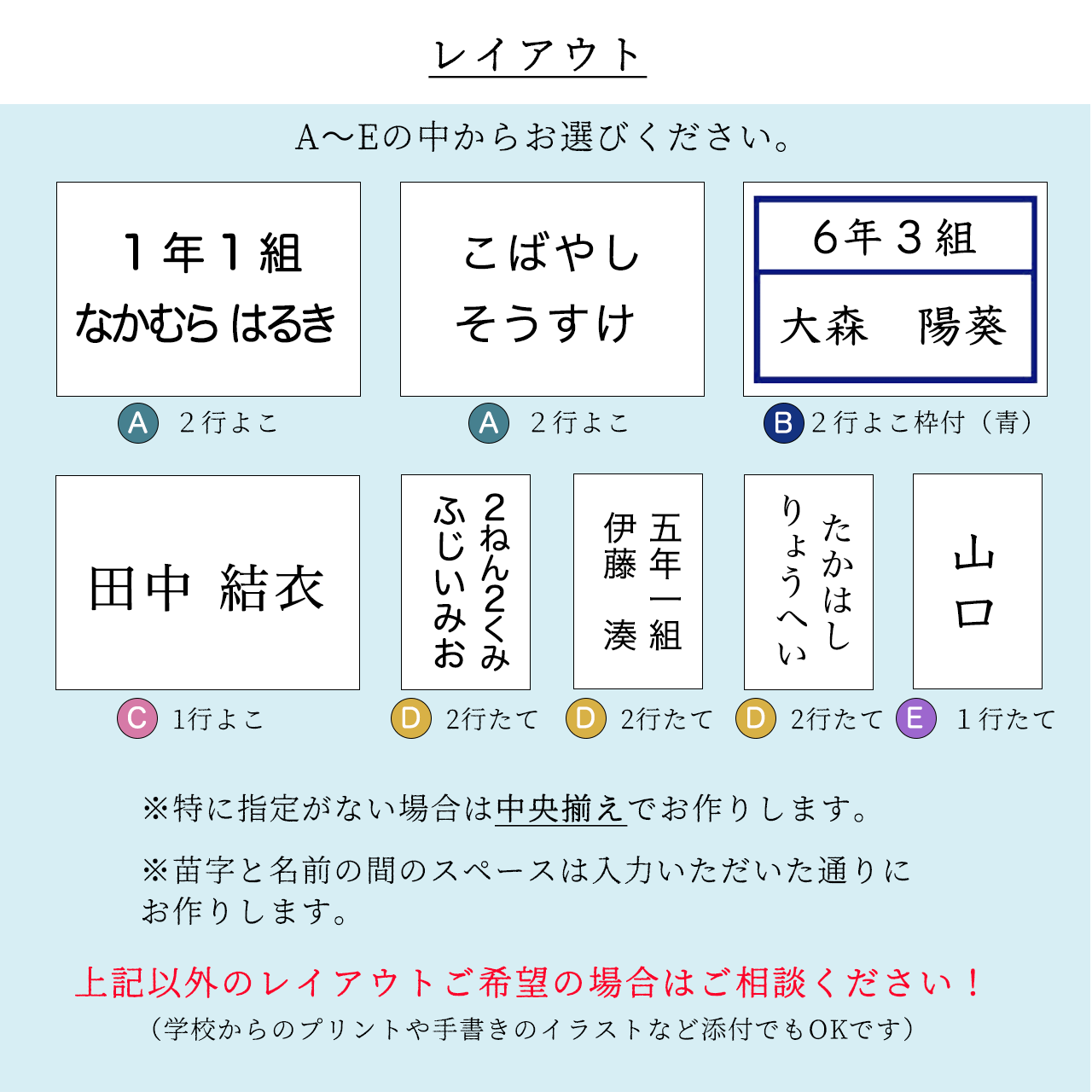 ・レイアウト/ A 2行よこ・B 2行よこ枠付(青)・C 一行よこ・D 2行たて・E 一行たて